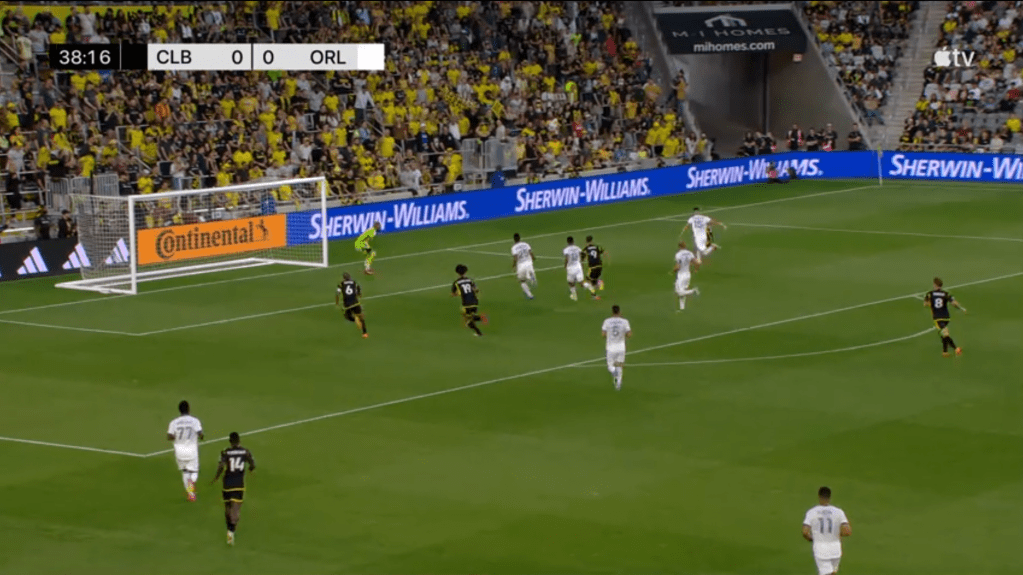 Hernadez is a player who wants to be mobile, sometimes to the detriment of his goal scoring, and that was what he was able to do against Orlando. While most of his attacking actions came from him cutting in from the left wing, Hernandez was able to get on the ball and move into dangerous positions. He also pulled back into the midfield at times, becoming essentially Columbus’ No. 10 with Lucas Zelarayan out and pulling the strings of the attack. This is what happened on the second Crew goal when Hernandez dropped and found an overlapping Farsi for his cross assist.