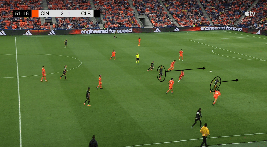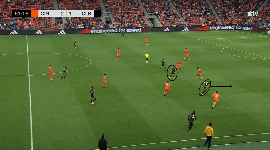 As we’ve discussed here before, one of the most utilized tactics by this Nancy offense is to try to manufacture counter attack opportunities while in possession. That is done by encouraging the center backs and goalkeeper to hold onto the ball while in possession and carry it directly into the teeth of the opposing defense. When the defense presses, Columbus looks to start a counter attack as if the team has just won the ball back.