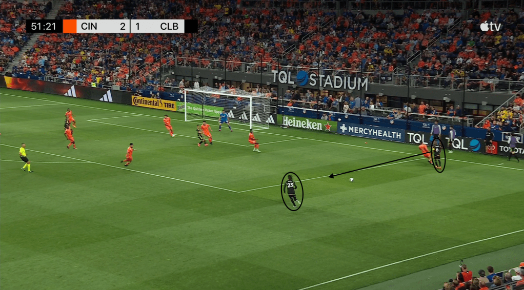 Amundsen’s leveler begins with a Cincinnati clearance. Attacking midfielder, and two-goal scorer Luciano Acosta, clears the ball downfield in hopes of starting an FC Cincy counter attack.