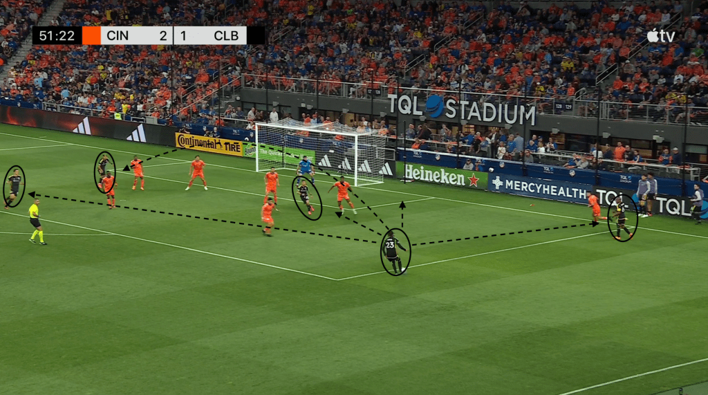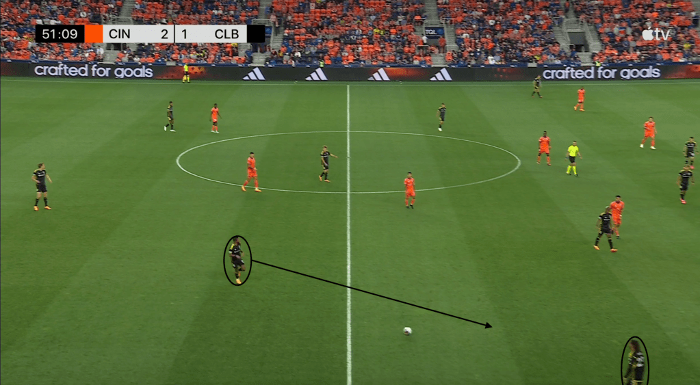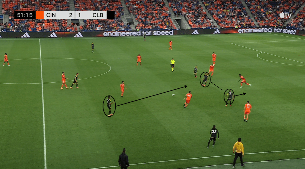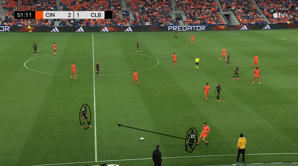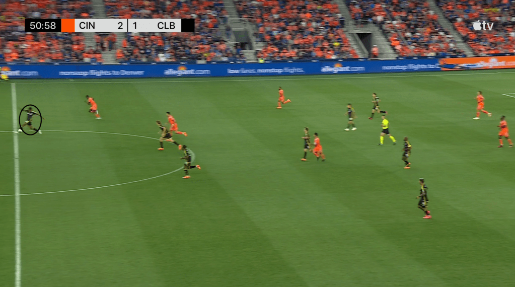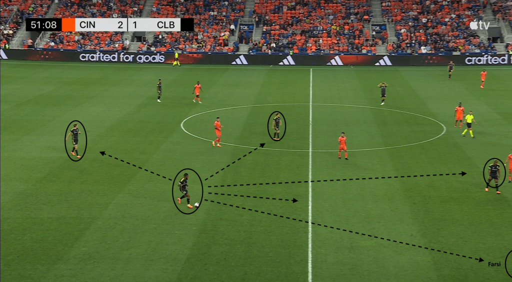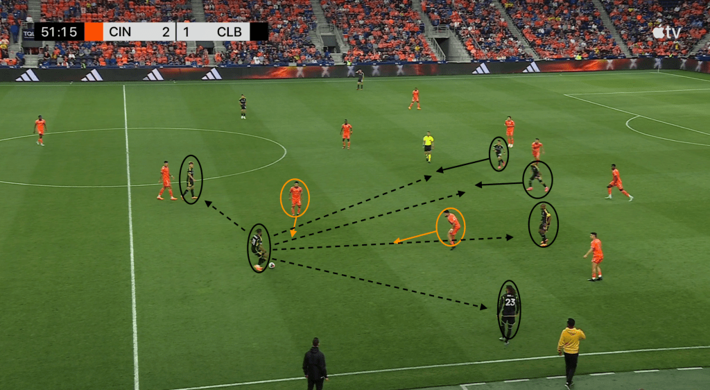 Here, however, FC Cincinnati does not take the bait, leaving Moreira unmarked with the ball and with five options. He can play a short pass to central midfielder Aidan Morris, try a long pass forward to other central midfielder Darlington Nagbe, continue to carry the ball forward, play a pass up the sideline to wing back Mohamed Farsi or try a drop pass back to center back Philip Quinton.