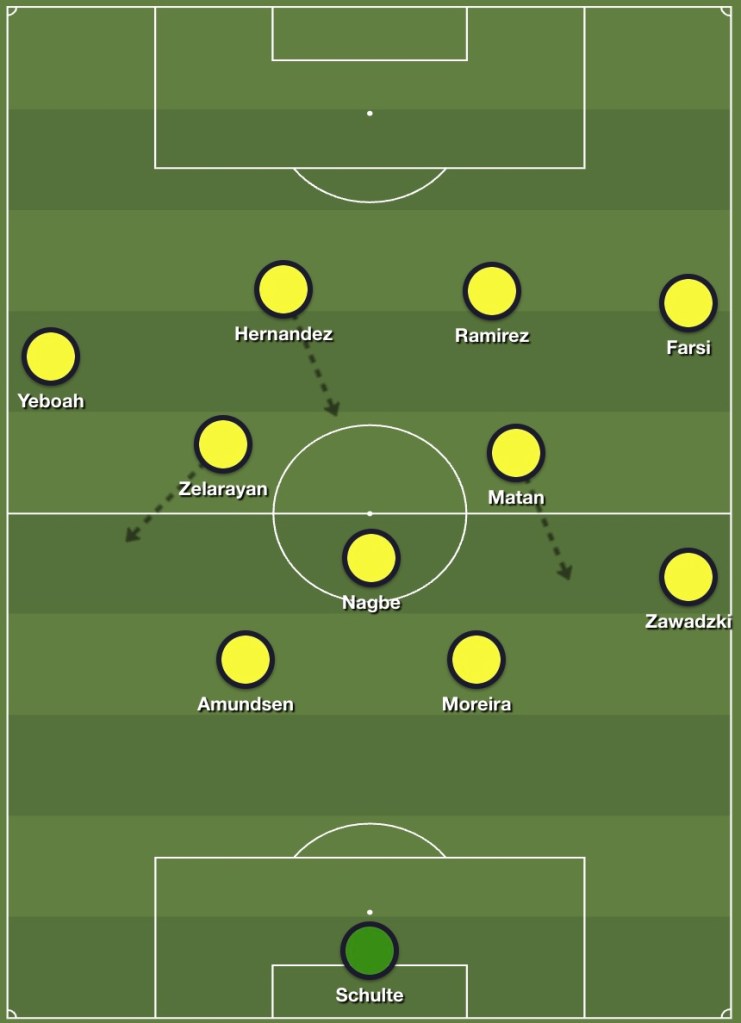 On the other side of the field, Amundsen slid further infield towards Moreira, like a second center back in a back four. Wing back Yaw Yeboah pushed up, leaving Zelarayan acres of space to receive the ball and take on players. Yeboah, Amundsen, Nagbe and a dropping Hernandez were support options, but the Armenian international often wanted to take players on himself.