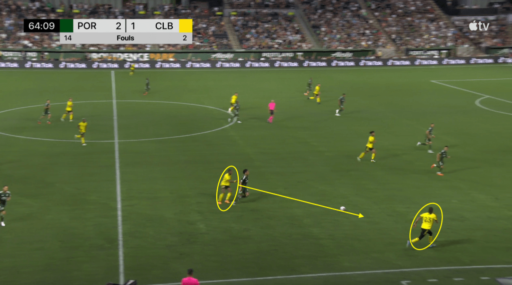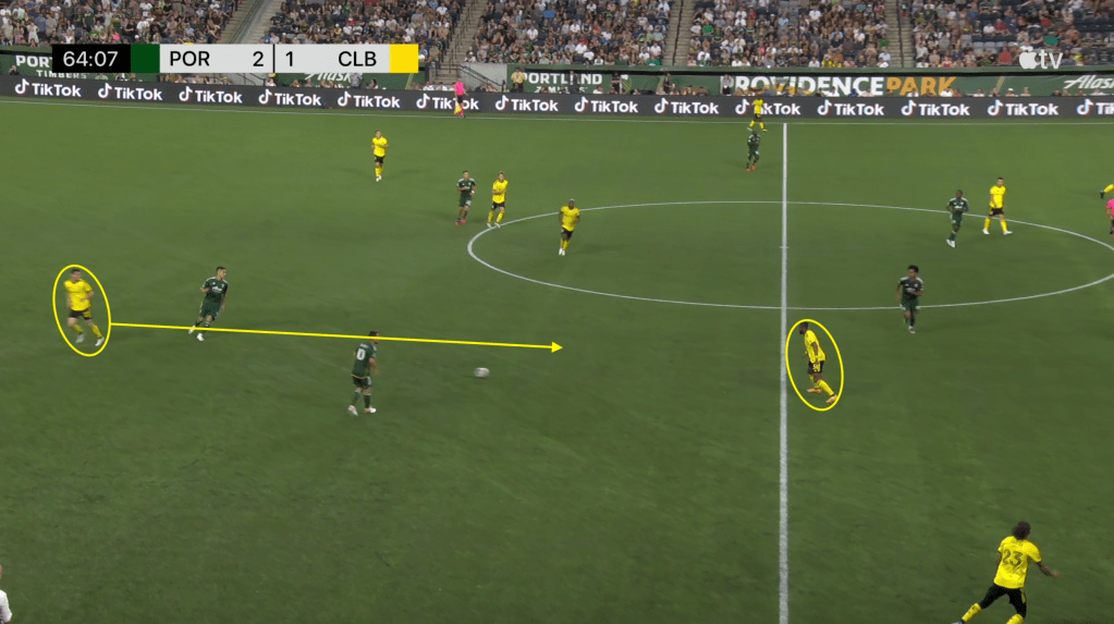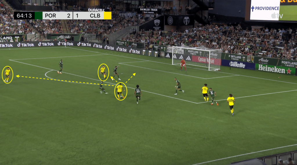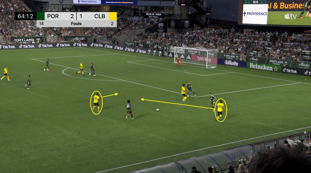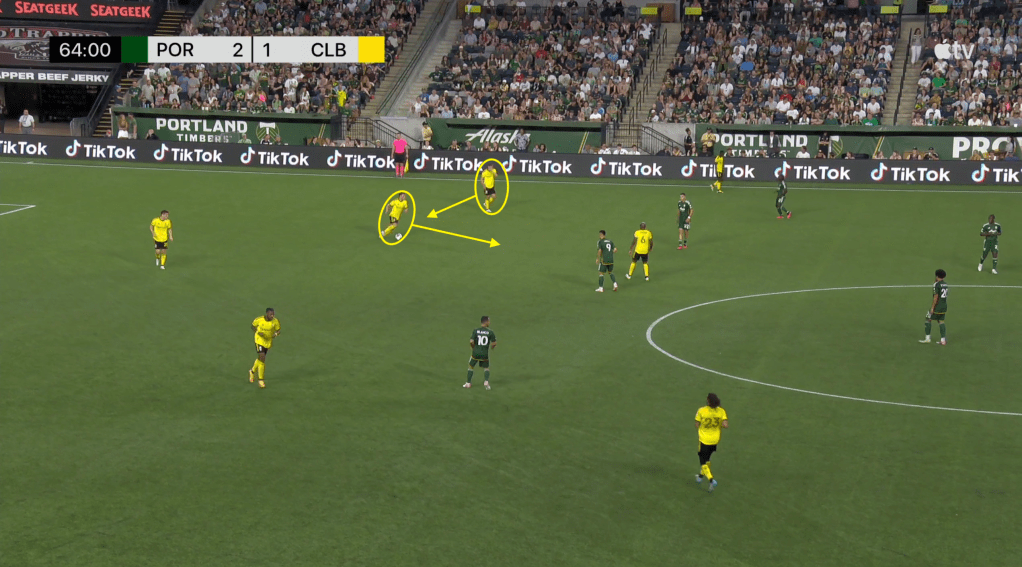 - Once again, the Crew uses an opponent’s press to the team’s advantage. The Black & Gold wait for the Timbers to add pressure and then look to quickly capitalize by finding an open man.