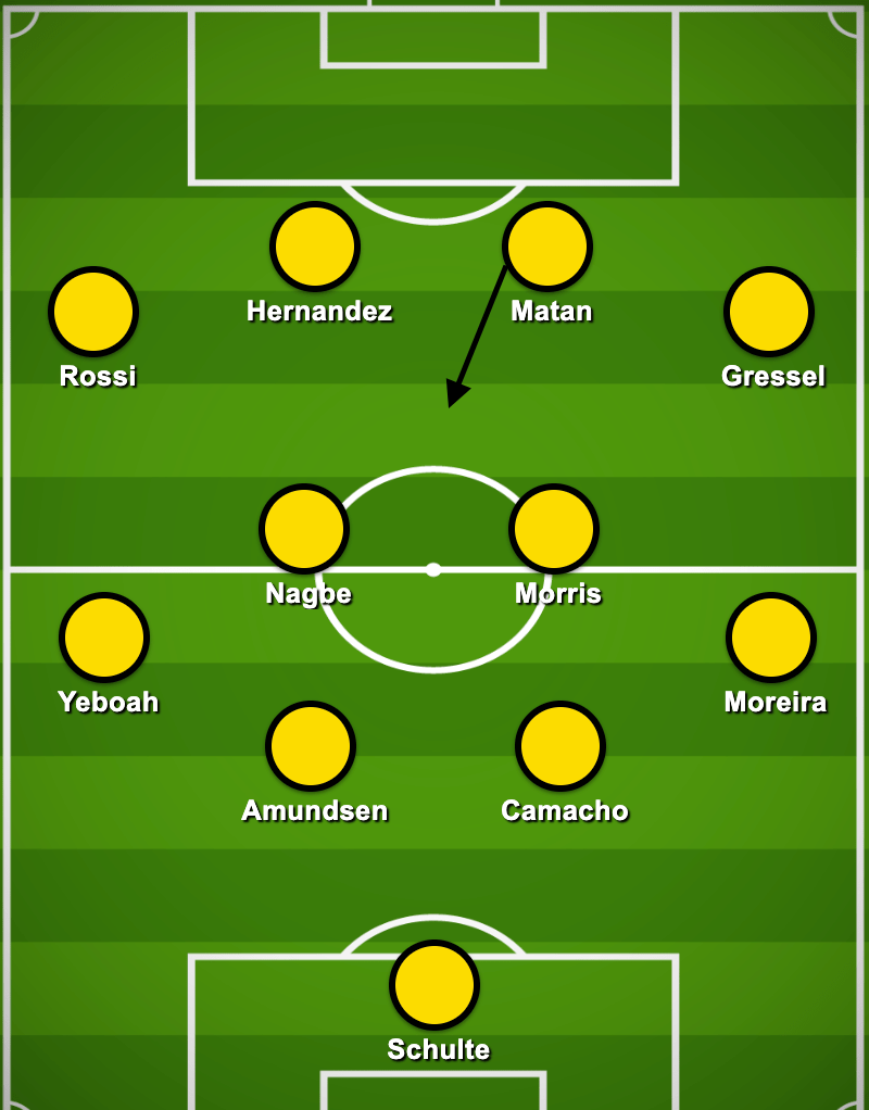 This change shifted things slightly for the Black & Gold. Nagbe was the lone central midfielder, although Moreira stepped up and Matan occasionally dropped to help. The change was definitely in the attacking mind, pushing for two goals to get all three points.