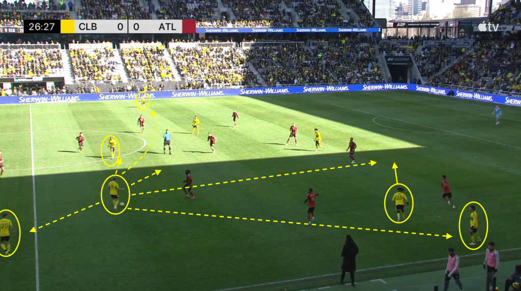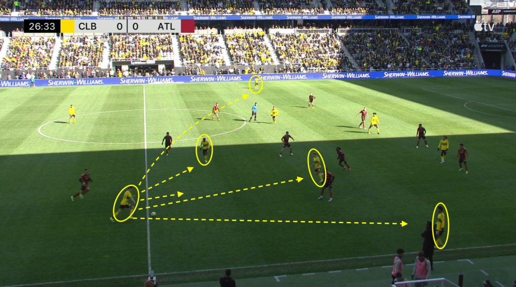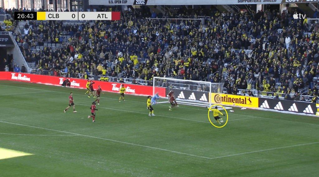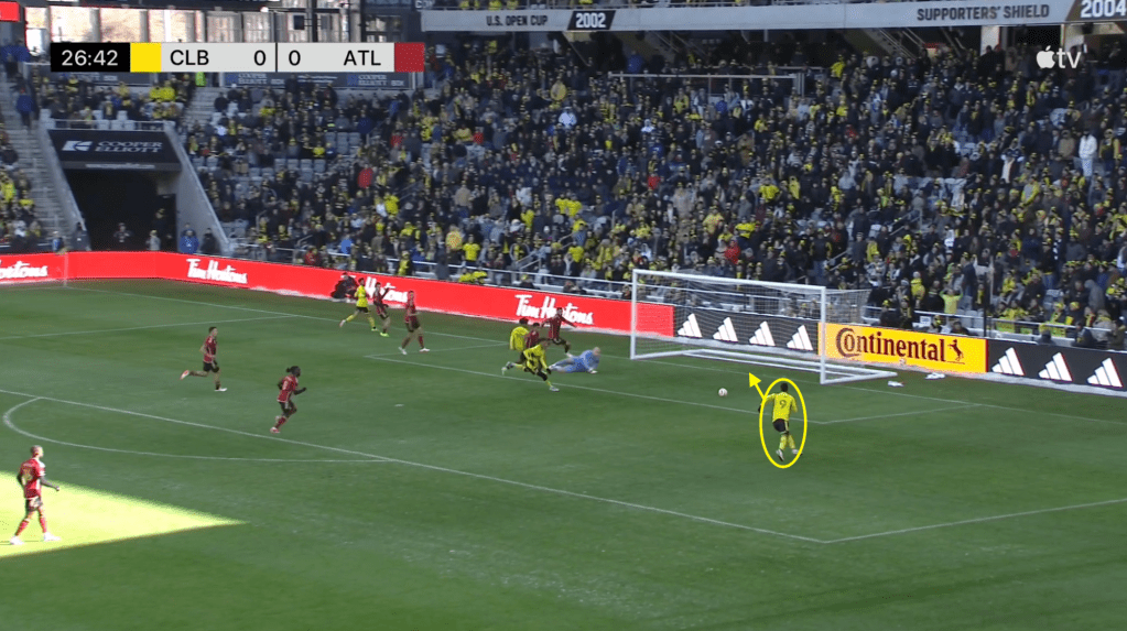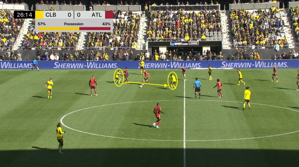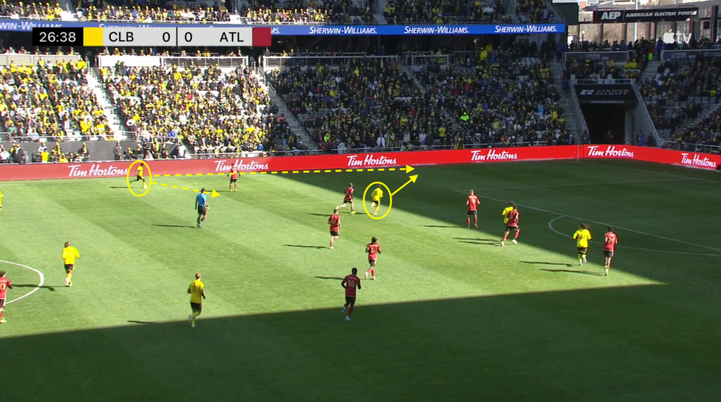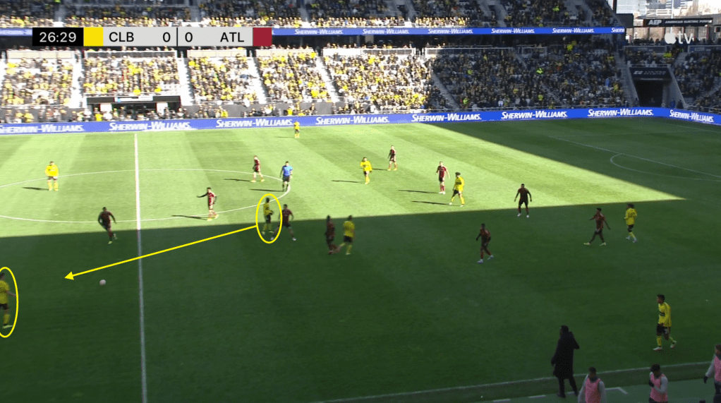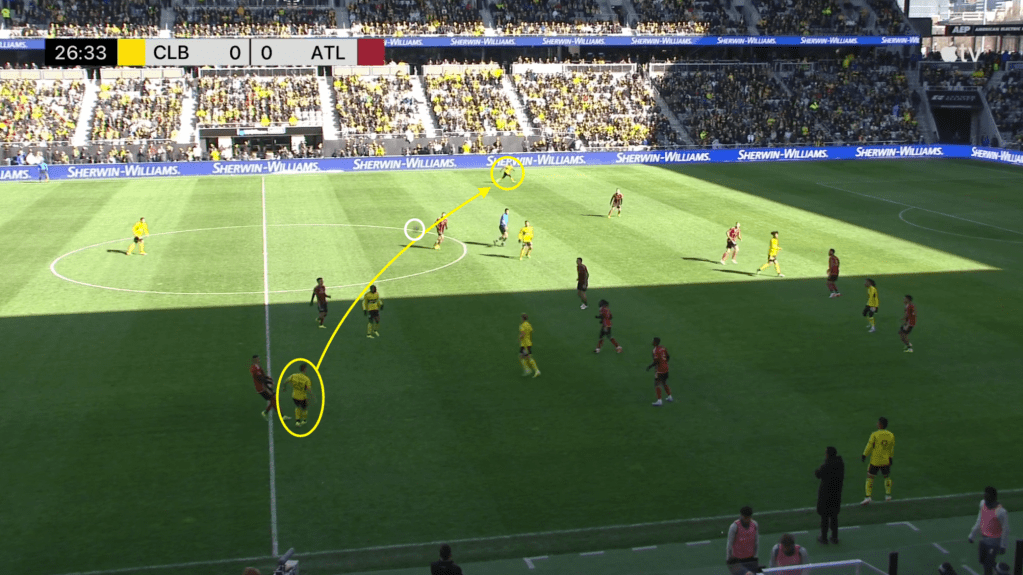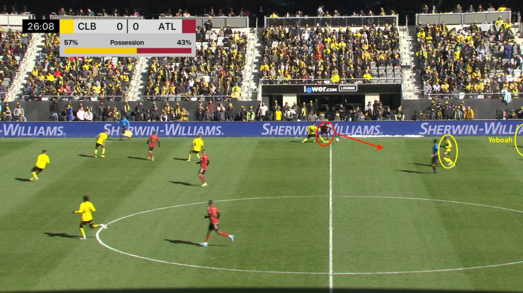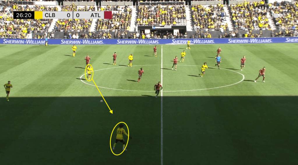 - Zawadzki’s long pass to Yeboah showed exactly how Columbus planned to attack the Five Stripes. The Black & Gold split the field in half, drawing Atlanta to one side before having a center-back or midfielder play a long pass to the opposite end of the field and setting off the counter-attack. This shift of play left Hernandez wide open on the back end (where the play began).