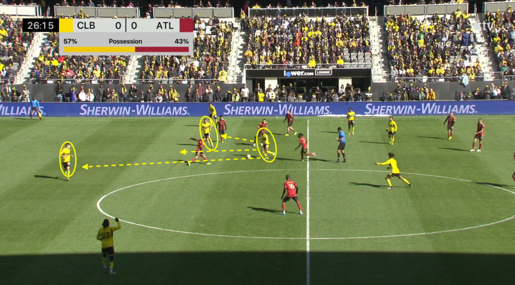 Columbus’ captain absorbs the pressure and defensive attention before playing a quick pass back to Morris.