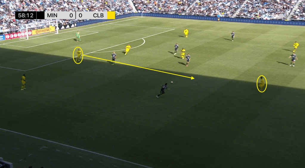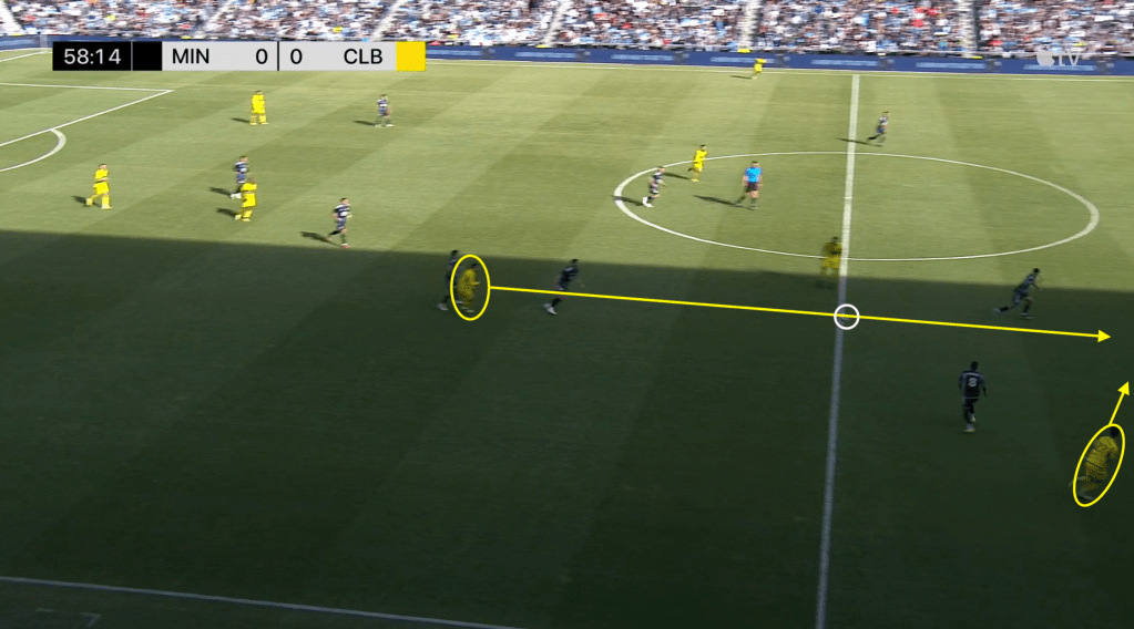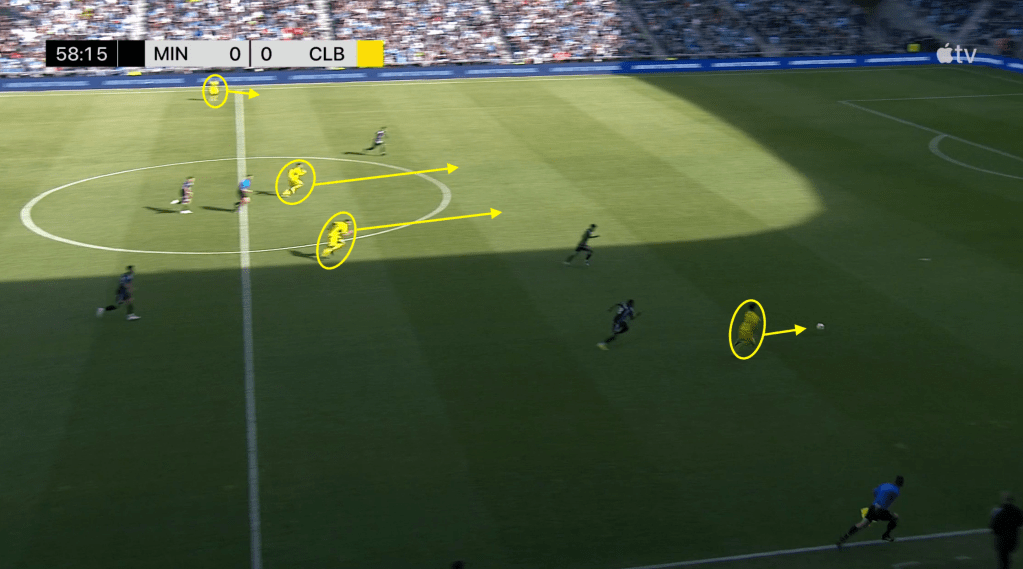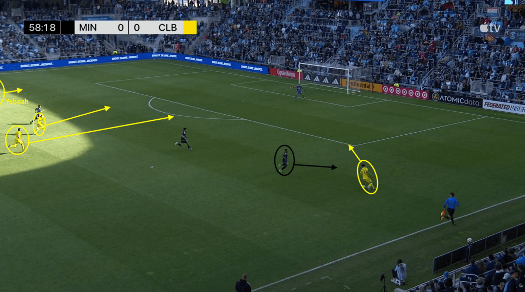 Arfsten easily outpaces Joseph Rosales and sets the Crew on the attack. Ramirez and Diego Rossi make attacking runs up the middle while Yaw Yeboah trails on the far left side.
