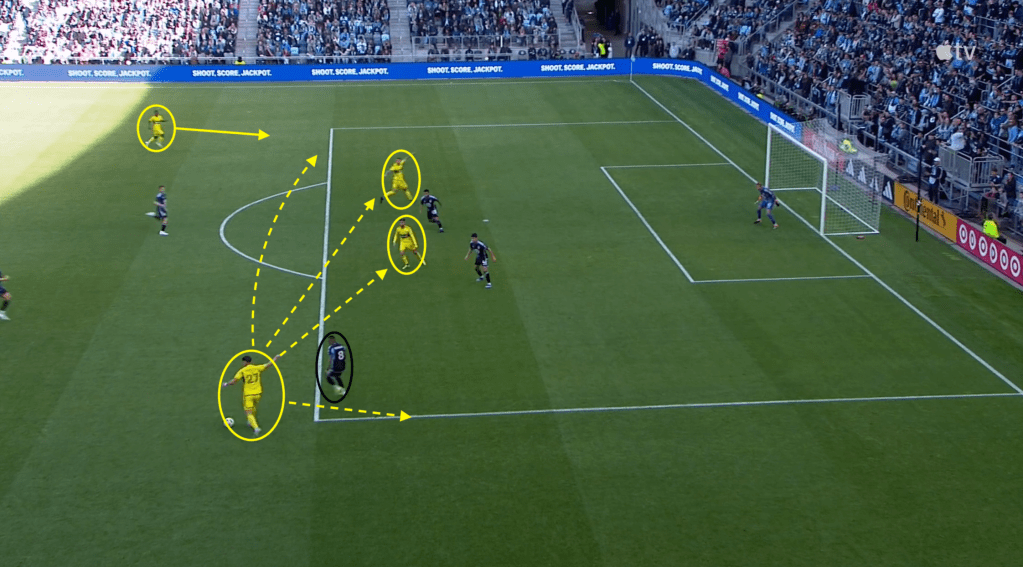 Arfsten reaches the corner of the goal-box where he has four options a long ball toward Yeboah, a diagonal pass to Ramirez, a quick touch to Rossi, or attempt to beat Rosales off the dribble.