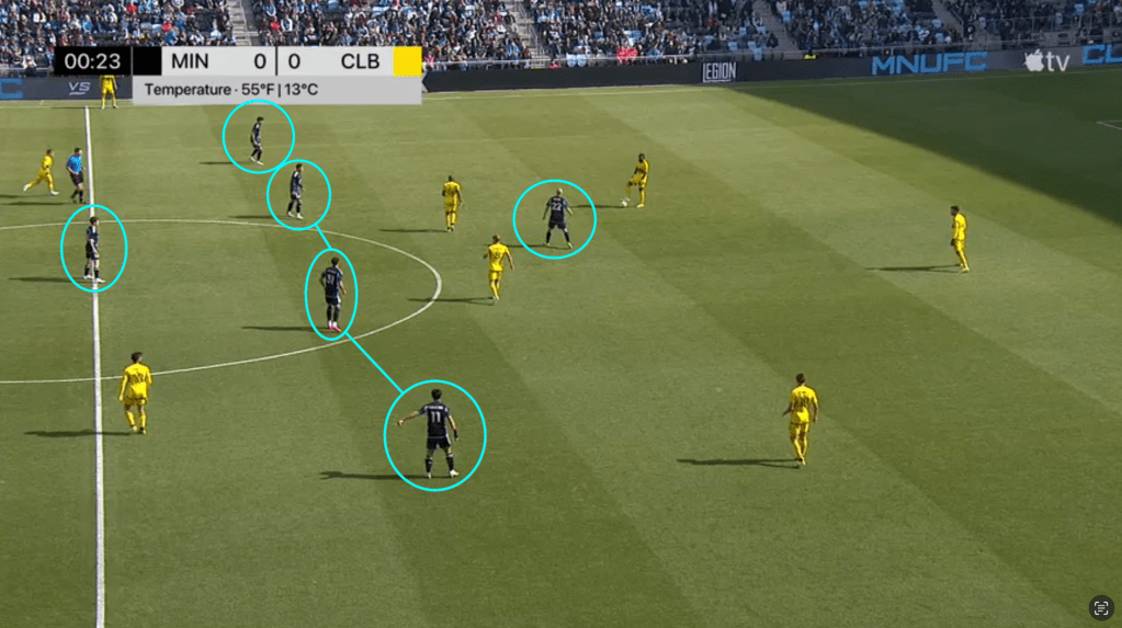 What made Minnesota’s press so potent was the structure and numbers they pressured with. On offense, Columbus likes to send both wingbacks high up the field as wingers. This means the three central defenders can spread out, with Aidan Morris and Darlington Nagbe being inside releases in the middle of the pitch.