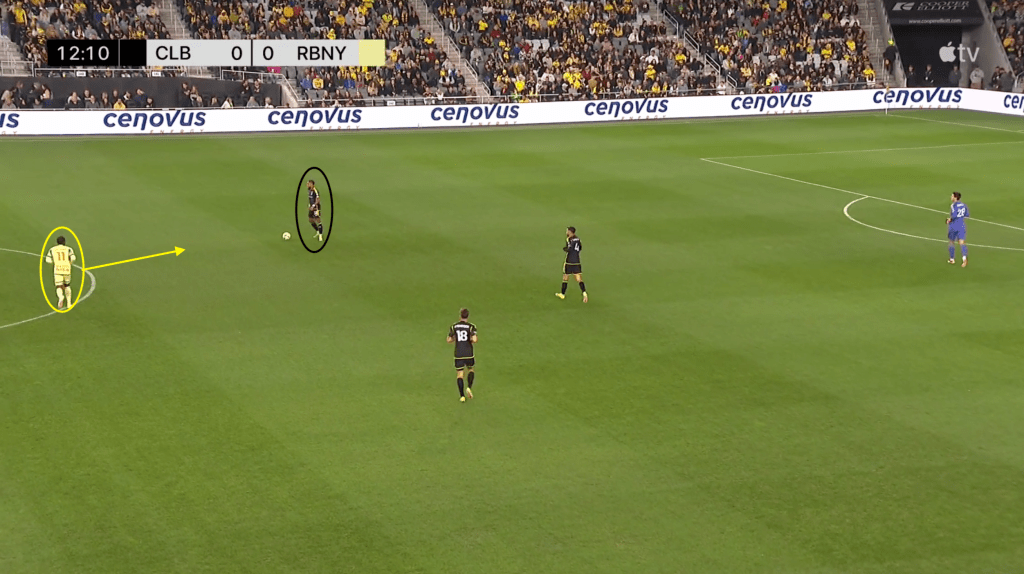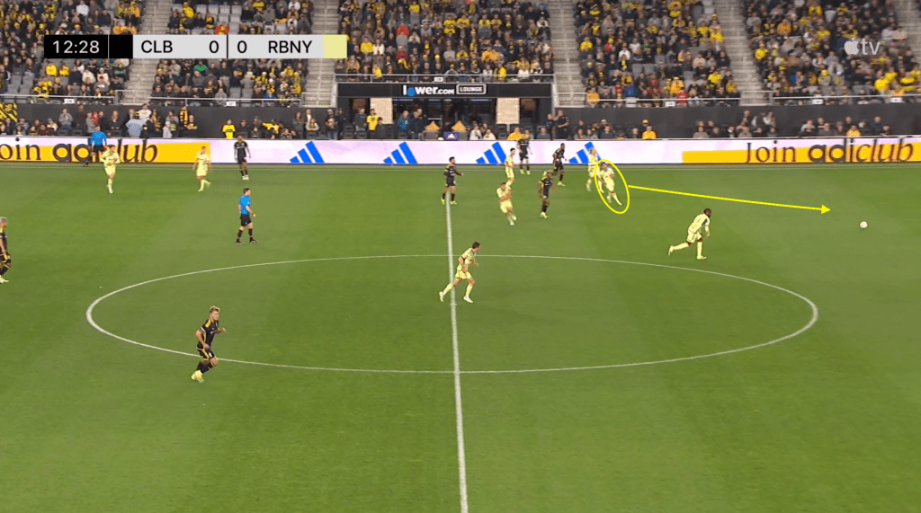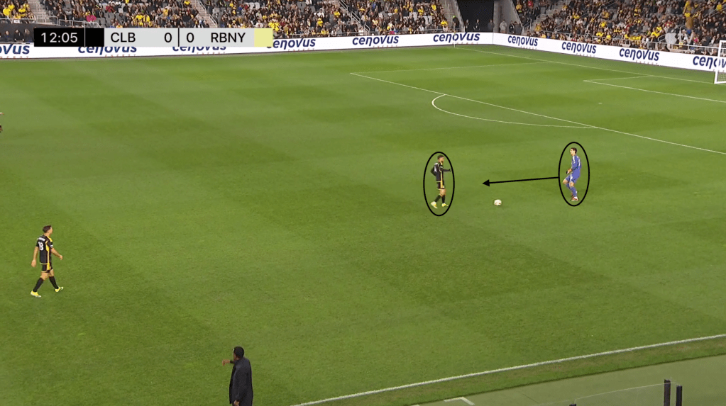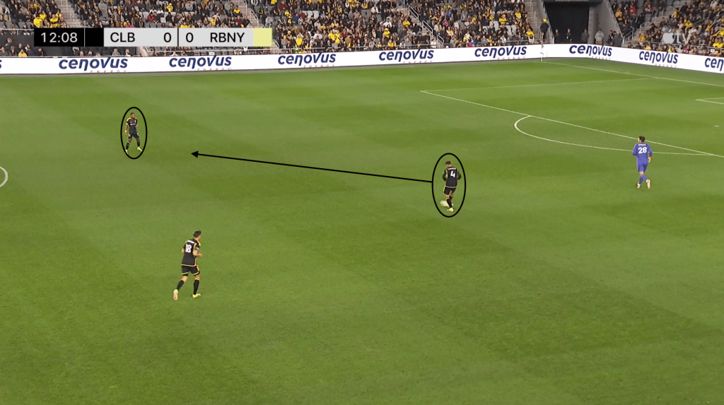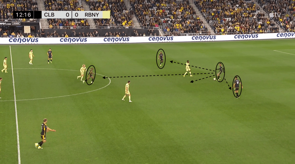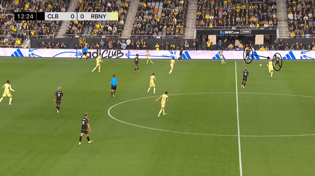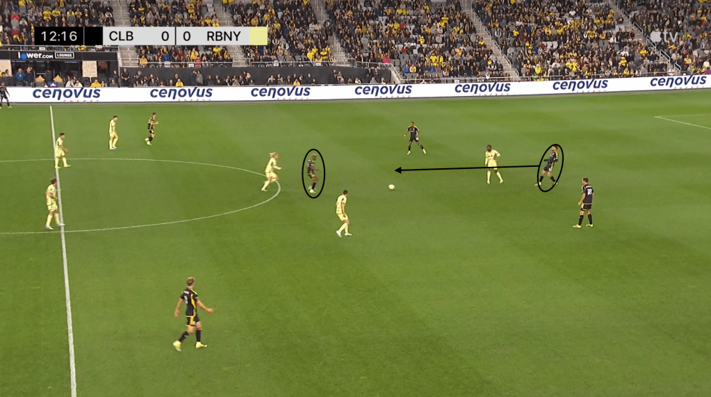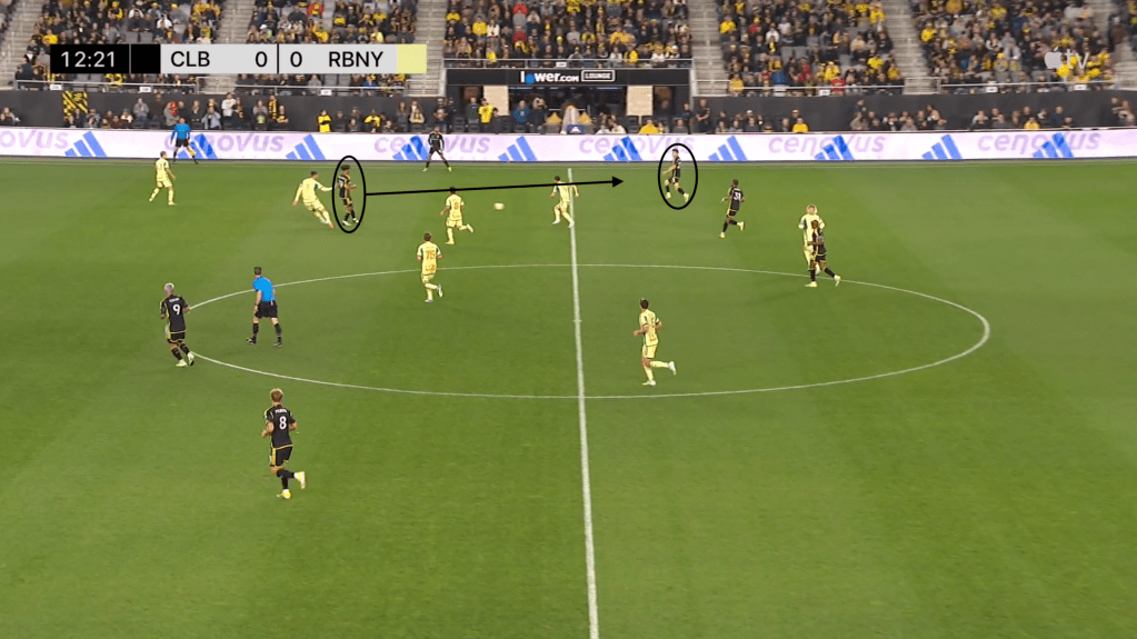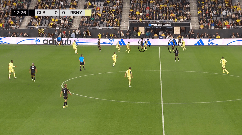 The Red Bulls are almost always a difficult matchup for Columbus but on Saturday the home side exerted its influence from the kickoff. The Black & Gold were happy to pass around New York’s trademark high-press and used their opponent’s over-commitment to stopping the ball as a tool to spring counter-attacks. That’s exactly what happens in the first goal of the match.