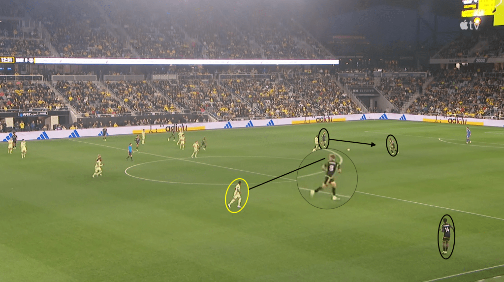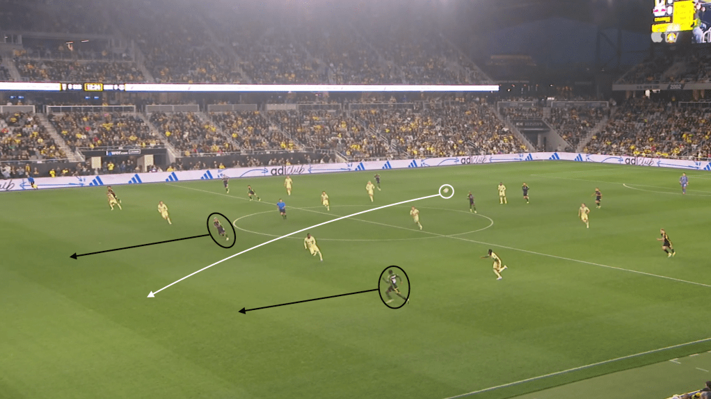At midfield, Aidan Morris turns first to see Yaw Yeboah totally un-marked on the left flank and then to see Kyle Duncan as the only defender on that side of the field.