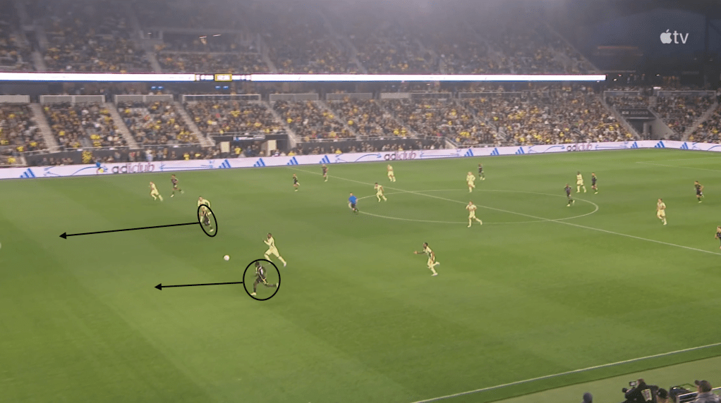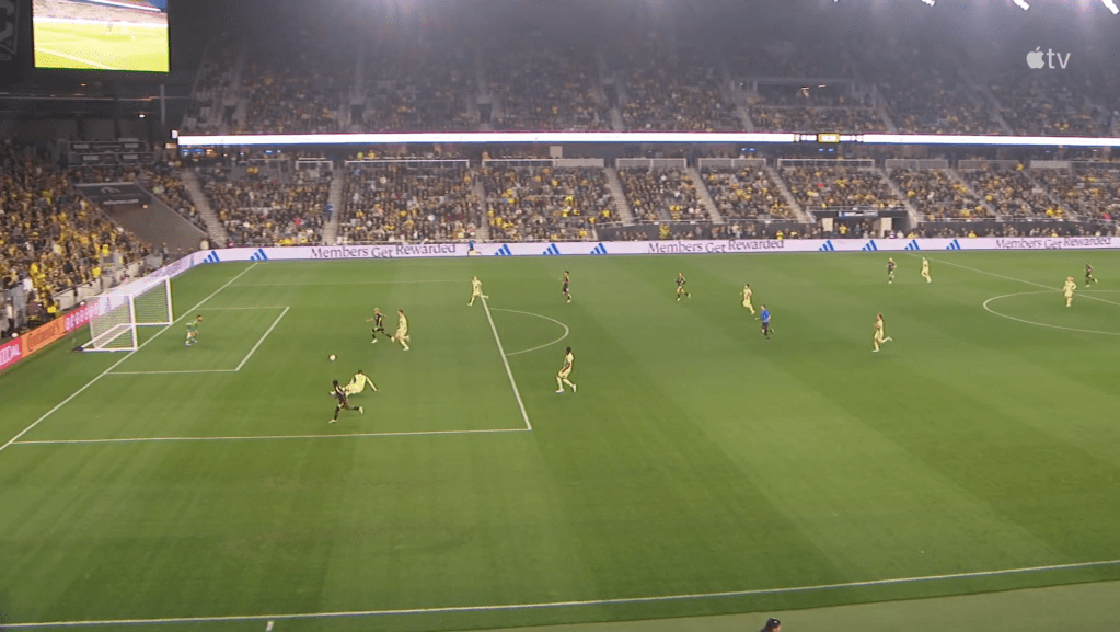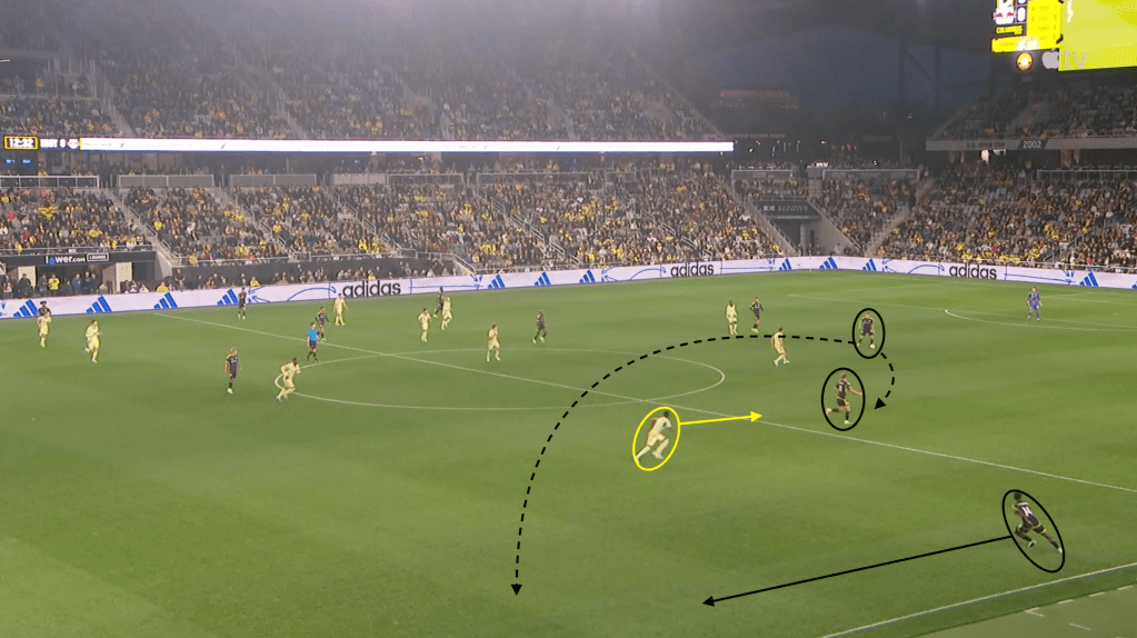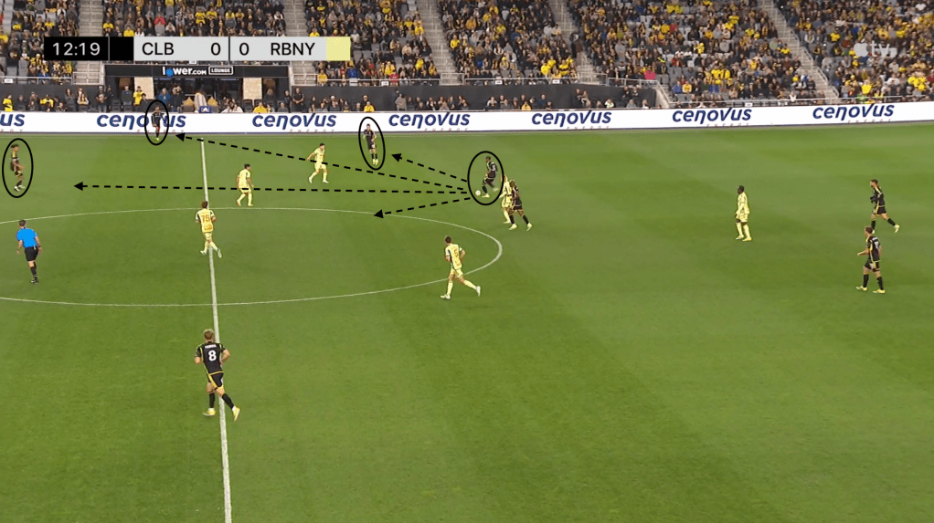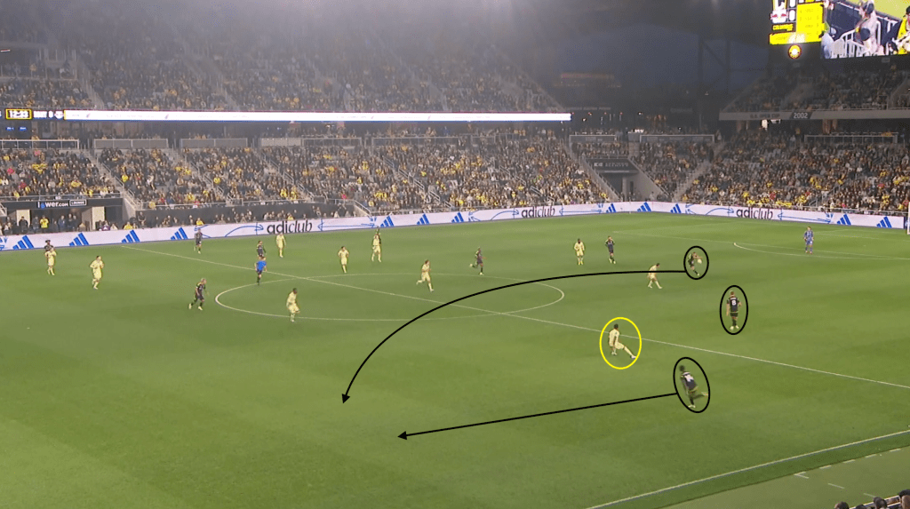 - The Crew act quickly but displayed a ton of patience during this build-up. A defender played a long pass forward multiple times only to see the ball immediately drop right back to the defense.