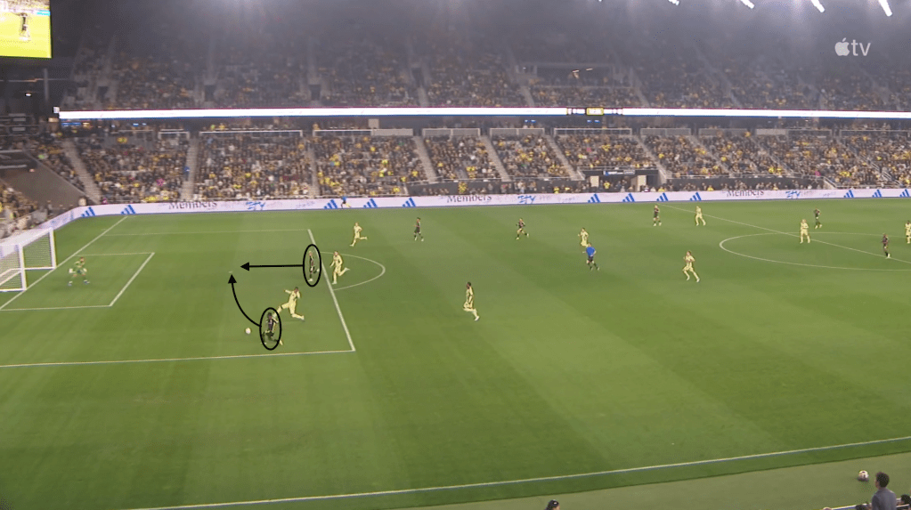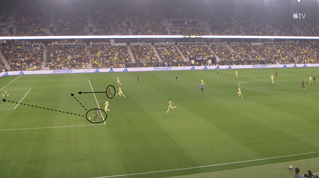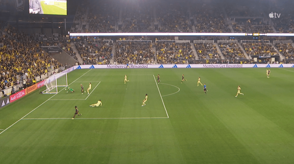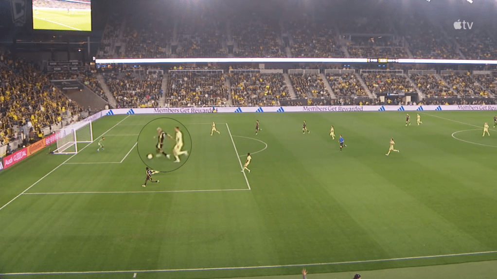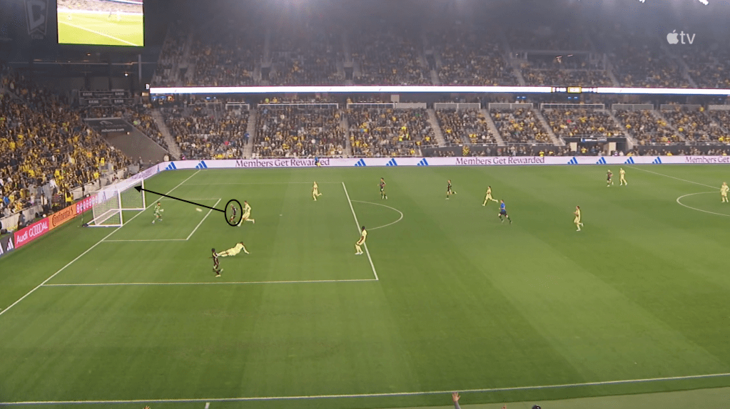 Just like he did in the 2023 MLS Cup, Amundsen hits a long pass out in front of a wide-open Yeboah.