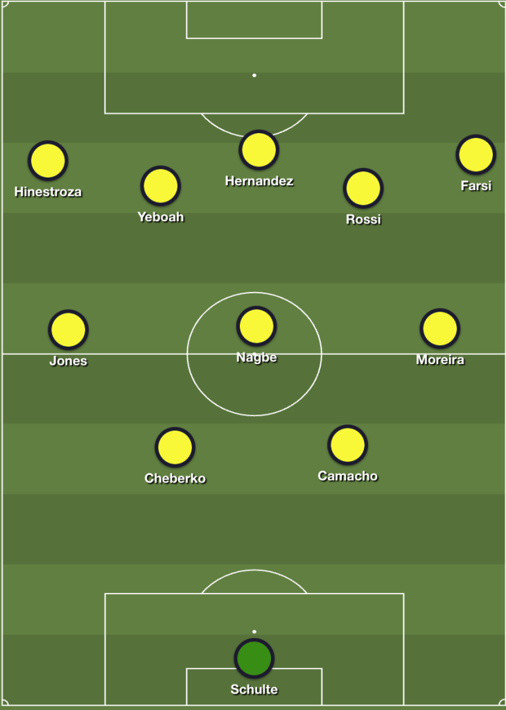 Darlington Nagbe stayed in the center of the pitch as a lone central midfielder while Derrick Jones shifted out to the left as a half-pivot.