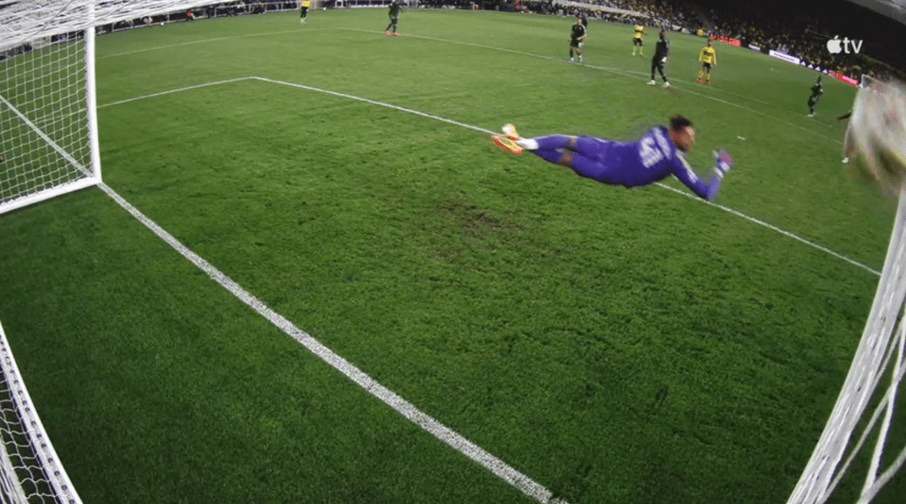 Pantemis is slightly blocked from getting an eye on Moreira’s shot but still picks up the ball as it leaves the right center-back’s foot.