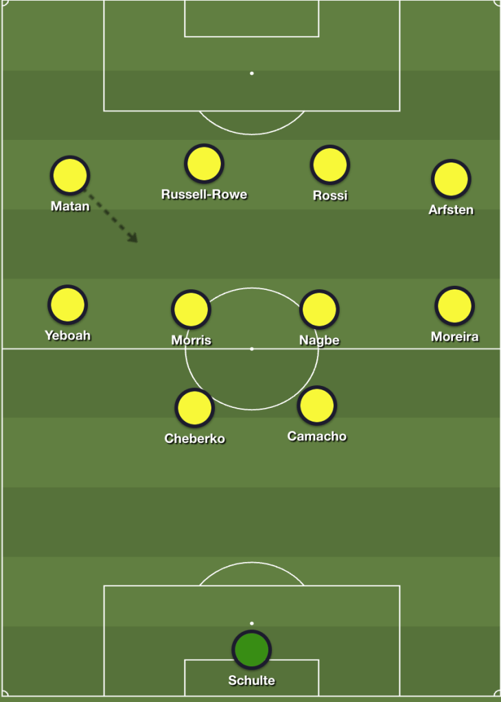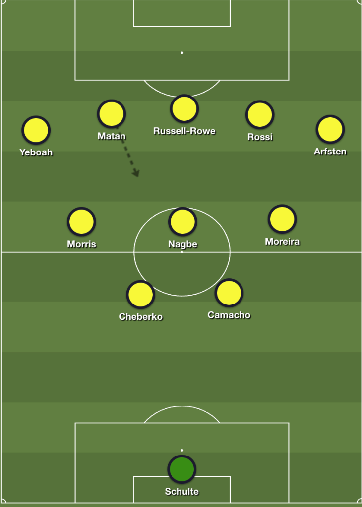 Often, Matan would drop deeper to act as a pivot for Yaw Yeboah, leaving Russell-Rowe and Rossi higher up the pitch. Rossi would occasionally drop in too, but would remain in an attacking midfielder space, rather than dropping as deep as Matan.