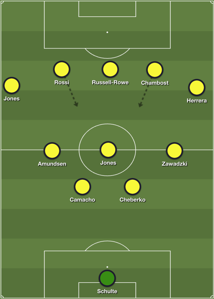 Not only did this put Zawadzki and a more attack minded Amundsen in those wide areas, but it also took a player out of the midfield to make space for the dropping wingbacks. Now Herrera and Dejuan Jones had more room to come back and assist in the buildup.