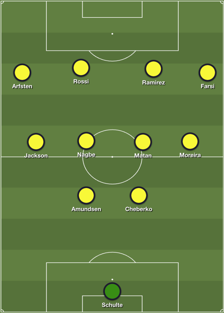 Patrick Schutle remained in goal with Yevhen Cheberko, Malte Amundsen, and Steven Moreira in front of him. Max Arfsten and Mo Farsi played on the wings with Darlington Nagbe and Alexandru Matan inside. The front three was rounded out by Jackson, Rossi and Ramirez.