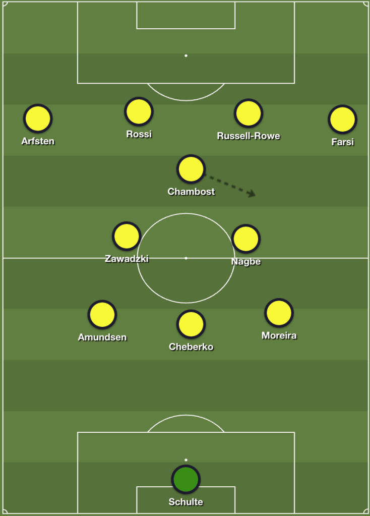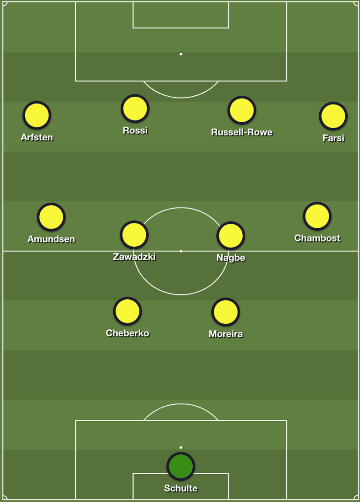 Let’s start off with the Crew. Columbus lined up in the typical 3-4-3/5-2-3 formation that has become commonplace under Nancy. Yevhen Cheberko anchored the center of the back three alongside Steven Moreira and Malte Amundsen. Mo Farsi and Max Arfsten flanked the defense, with Darlington Nagbe and Sean Zawadzki in the center of the midfield. The front three was rounded out by Dylan Chambost, Russell-Rowe and Rossi.
