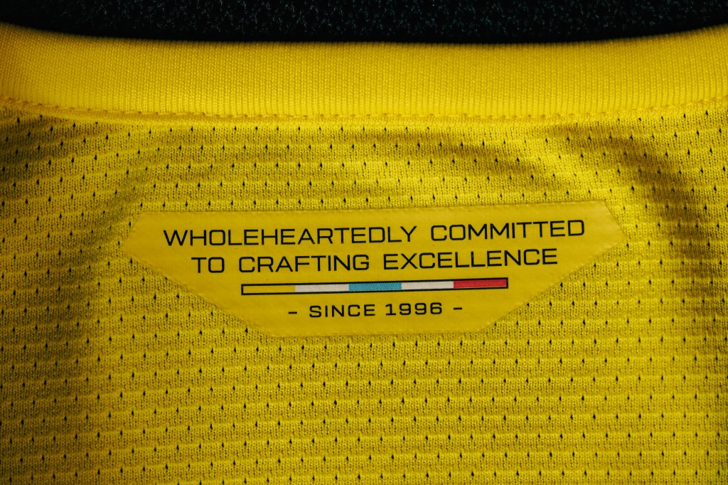 The top also features a secondary design, with the words “Wholeheartedly Committed to Crafting Excellence,” with the Crew’s founding year of 1996 inside the neck. The palettes show the colors coral and teal, which were debuted with the Clubs travel gear this year.